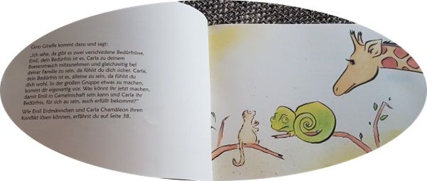 Ich sage Euch auch warum, das Buch ist toll aufgebaut. Erst spricht die Giraffe, die im folgenden alles zusammenfasst. Dann werden die einzelnen Konflikte zwischen zwei Tieren beschrieben und nach jedem Konflikt fasst die Giraffe zusammen, welches Bedürfnis wer hat. Dies ist super einfach geschrieben und für Kinder verständlich.